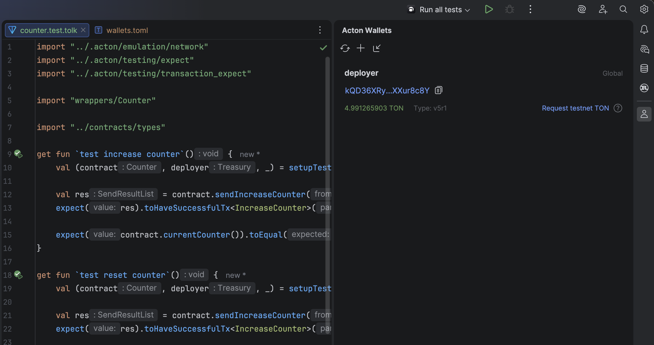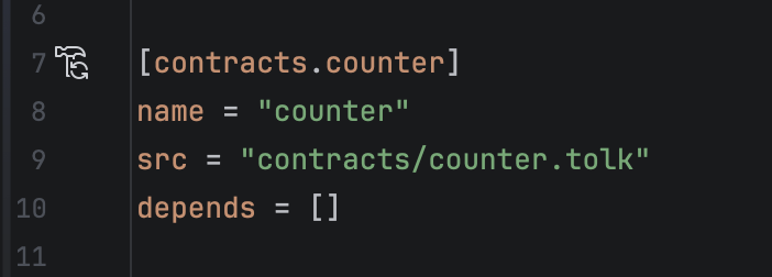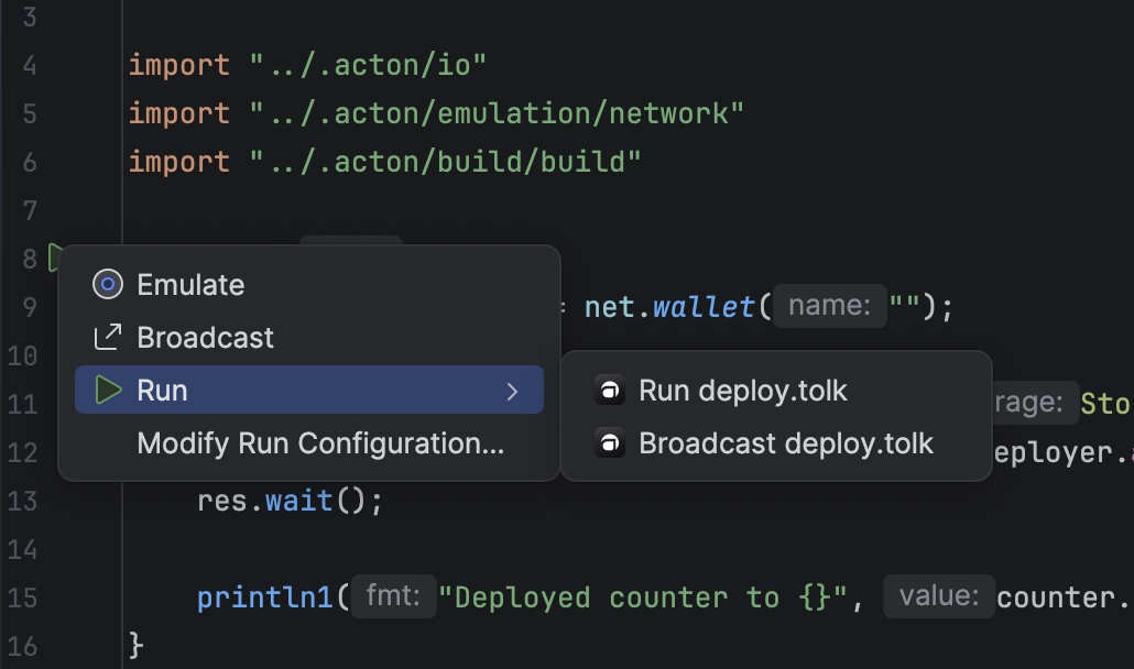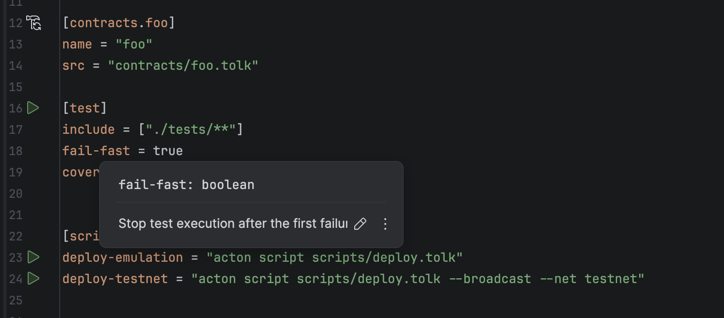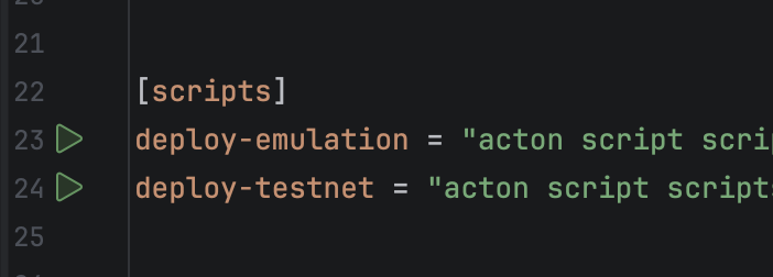 Gutter icons allow running builds, tests, or scripts directly from the Acton.toml file.