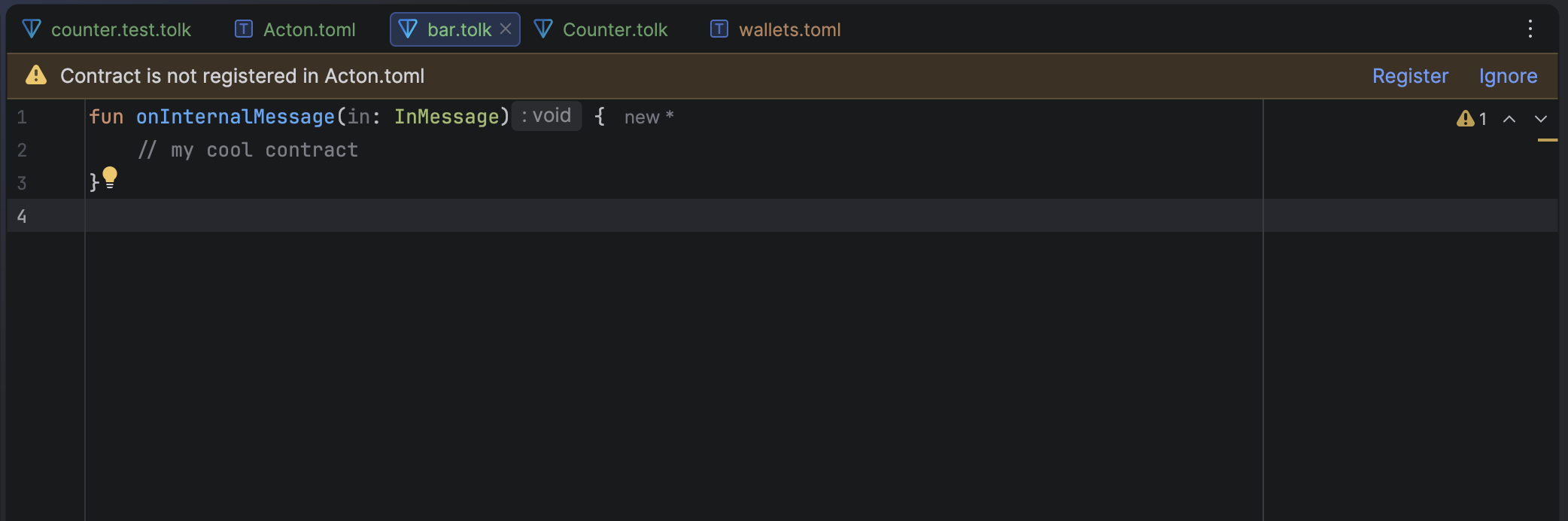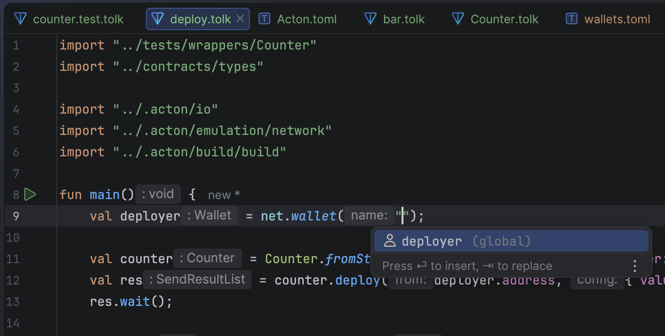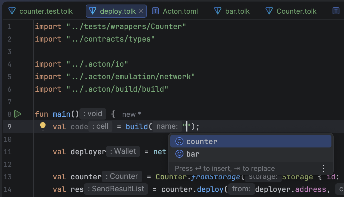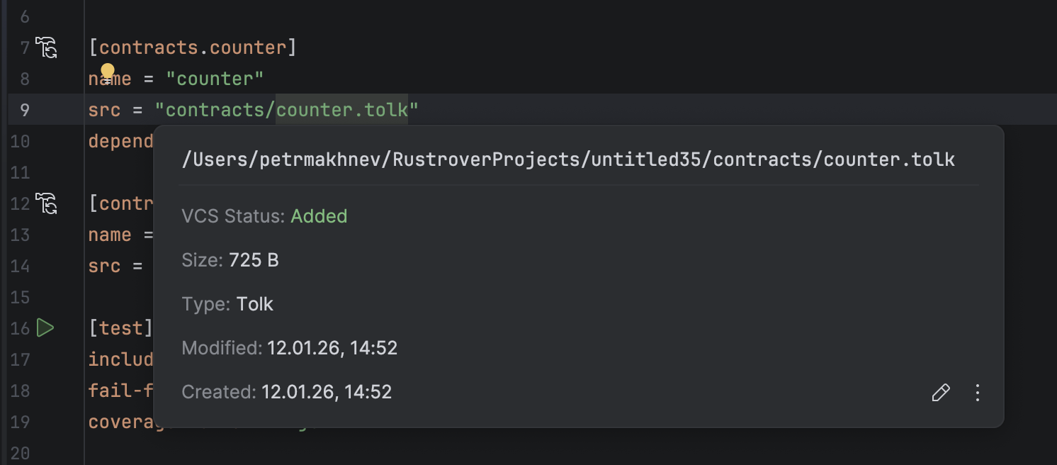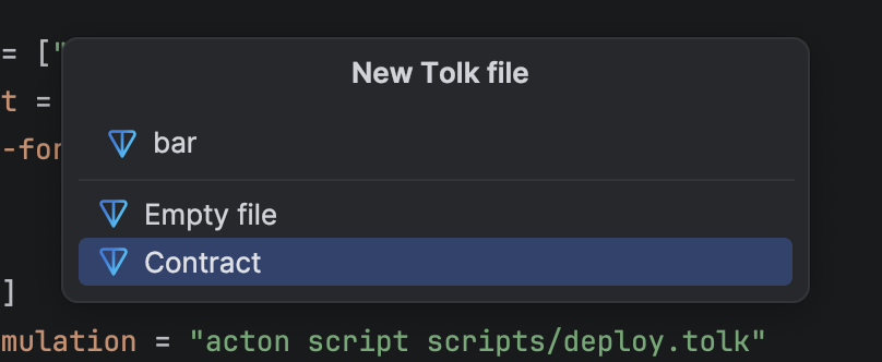 The plugin includes a wizard to create new Tolk files and automatically register them in Acton.toml.
