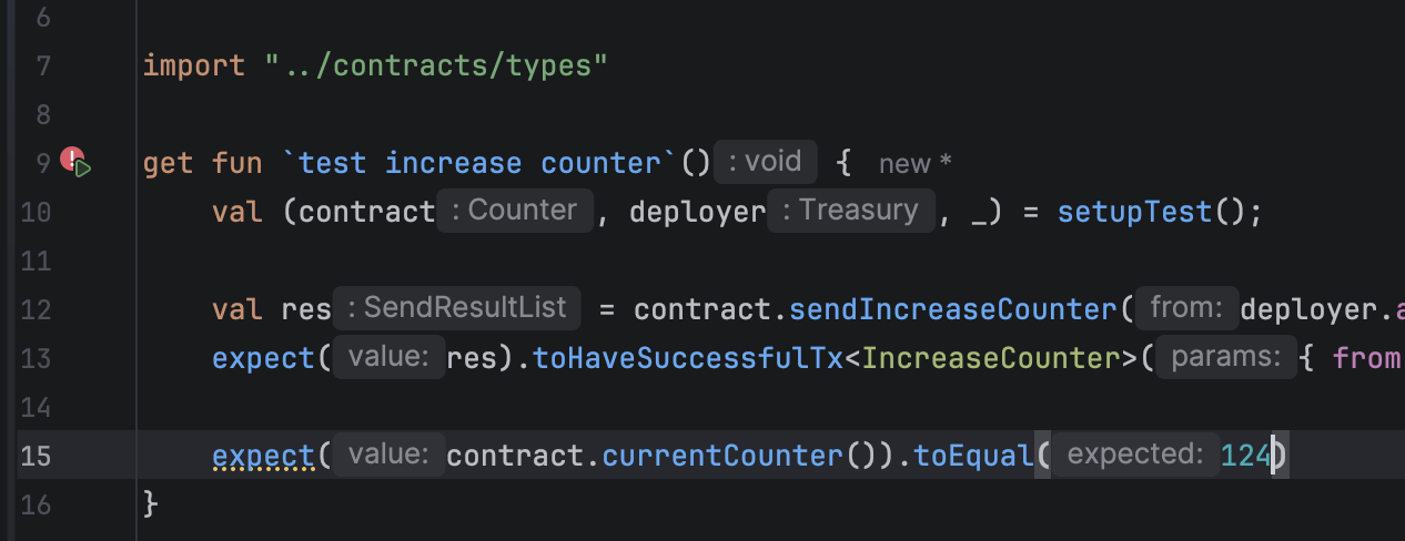 When a test fails, the plugin highlights the specific expect call that failed and changes the test icon.