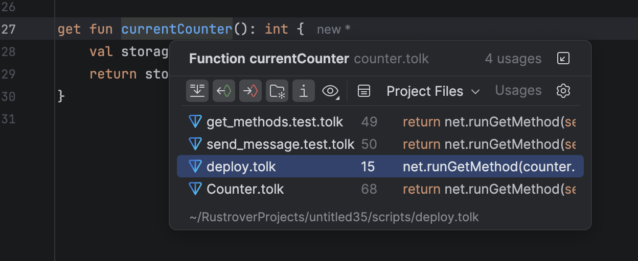 The plugin also finds usages of get methods within net.runGetMethod() during a reference search.