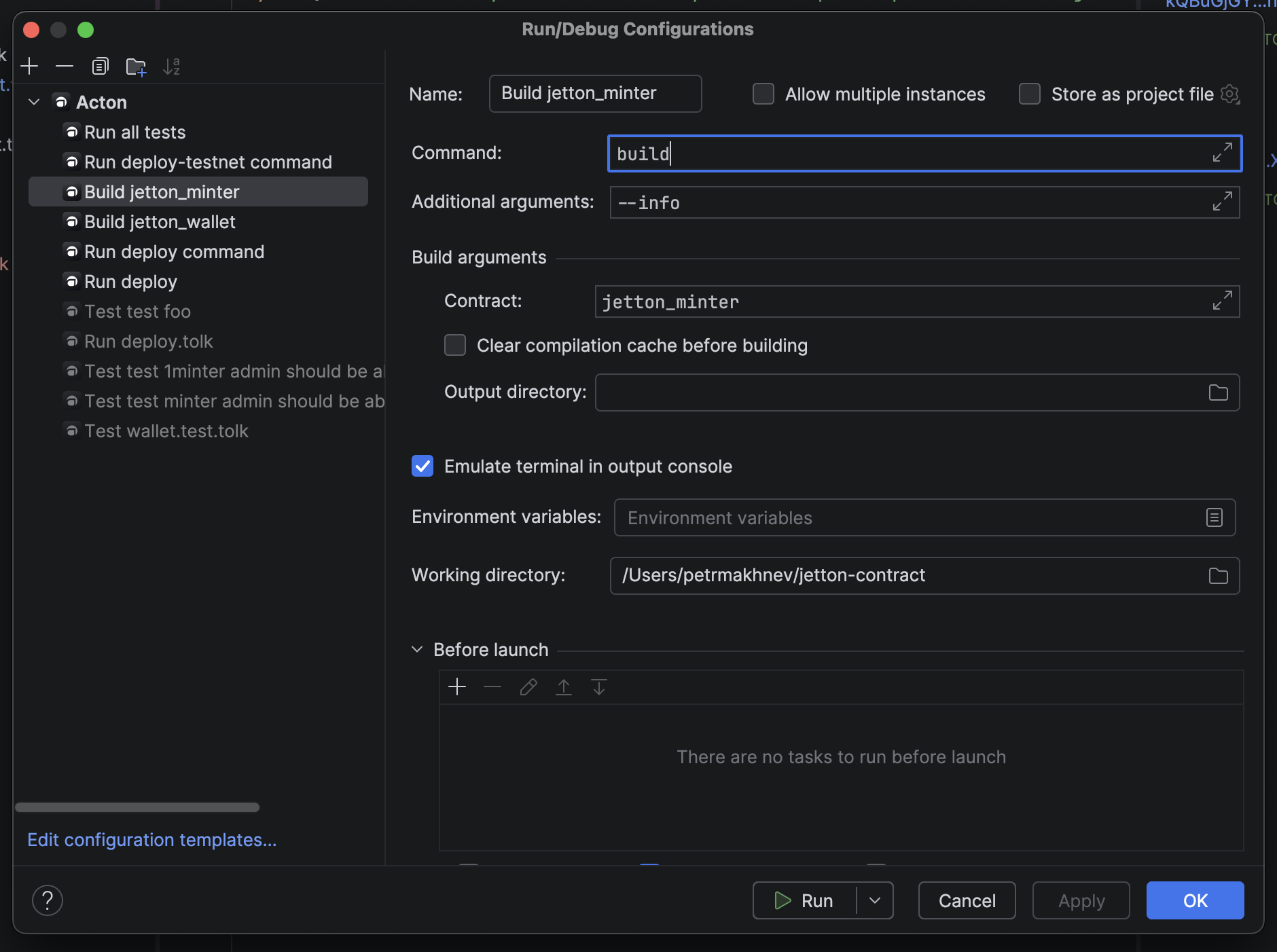 You can also manually create run configurations for any Acton command. Specialized interfaces are available for some commands like build or test.