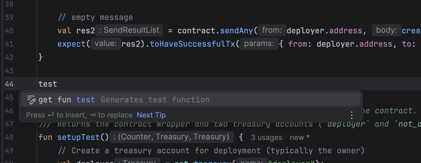 The test live template allows generating test structures by typing test and pressing Tab.