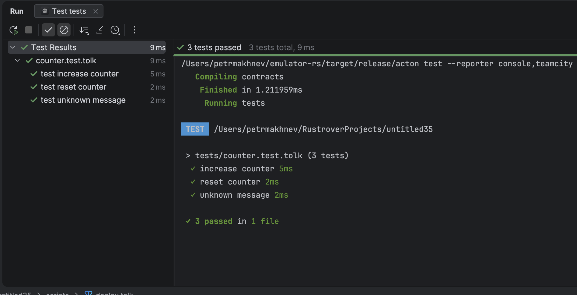 Acton tests integrate with the IDE's native test runner, providing a hierarchical view and progress indicators.